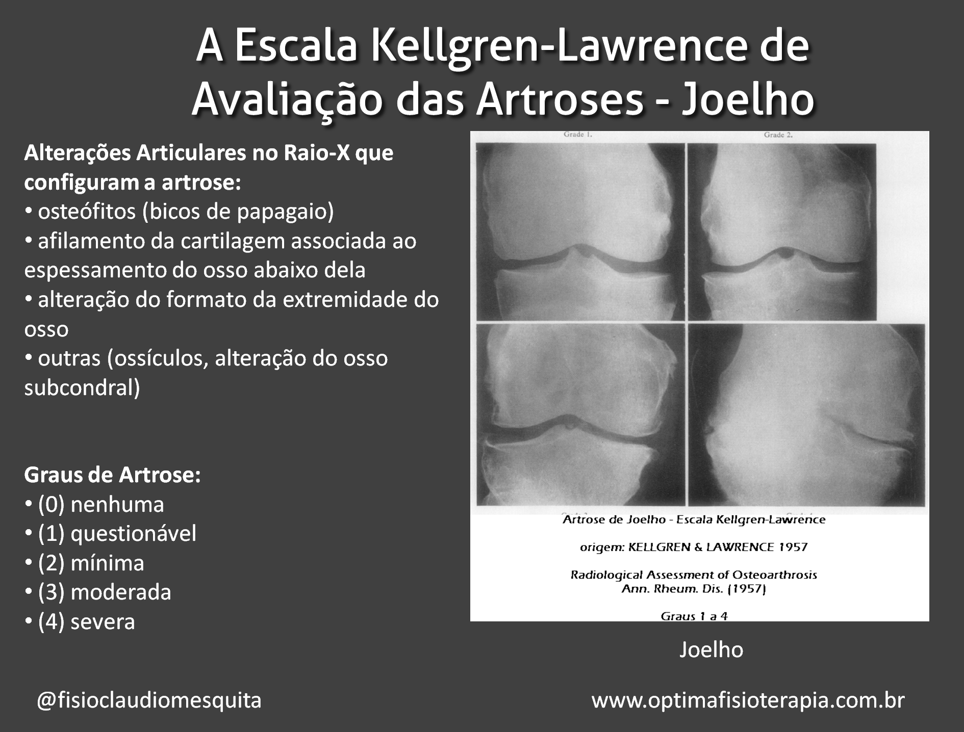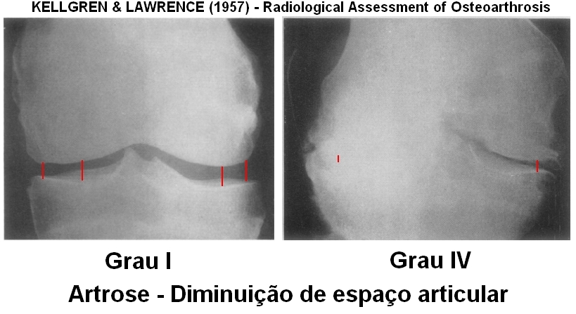 A avaliação da gravidade da Artrose de Joelho é feita pela radiografia. Para isso, usa-se a  escala KELLGREN-LAWRENCE. Nela se verificam as seguintes alterações da articulação: