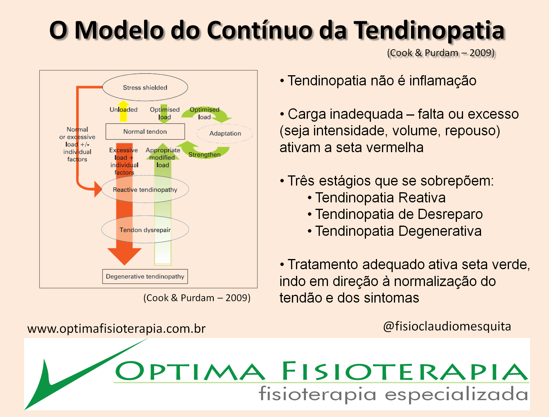 Existem, basicamente, 3 tipos de Tendinopatias. . Tendinopatia Reativa Ocorre após excesso de atividade ou falta de recuperação adequada. . Tendinopatia de Desreparo O tendão começa a apresentar desorganização e enfraquecimento das fibras e colágeno. . Tendinopatia Degenerativa Desorganização e enfraquecimento mais significativos do tendão. Mais frequente em pessoas idosos.