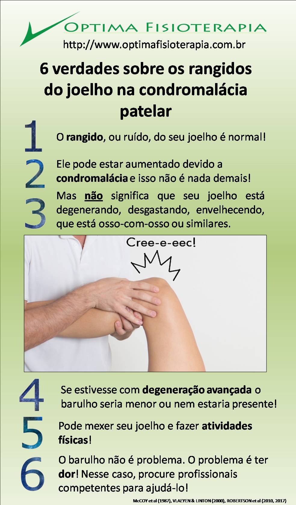 Vale lembrar que não estamos falando de estalos!!! Estalos têm outra origem que parecem não se relacionar à condromalácia ou a qualquer patologia (3).